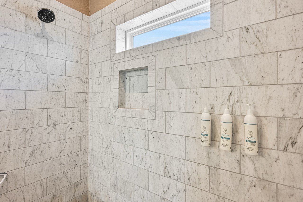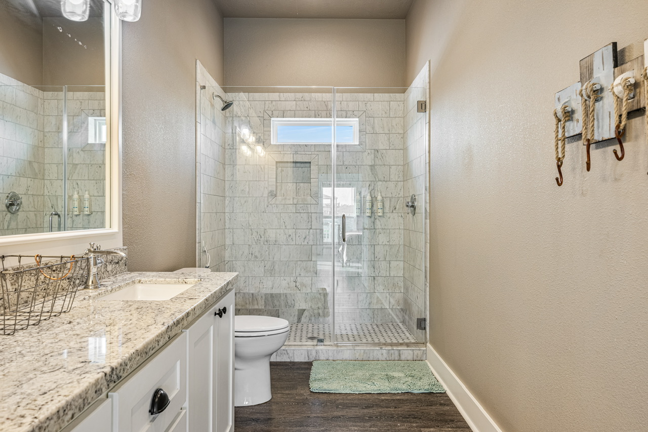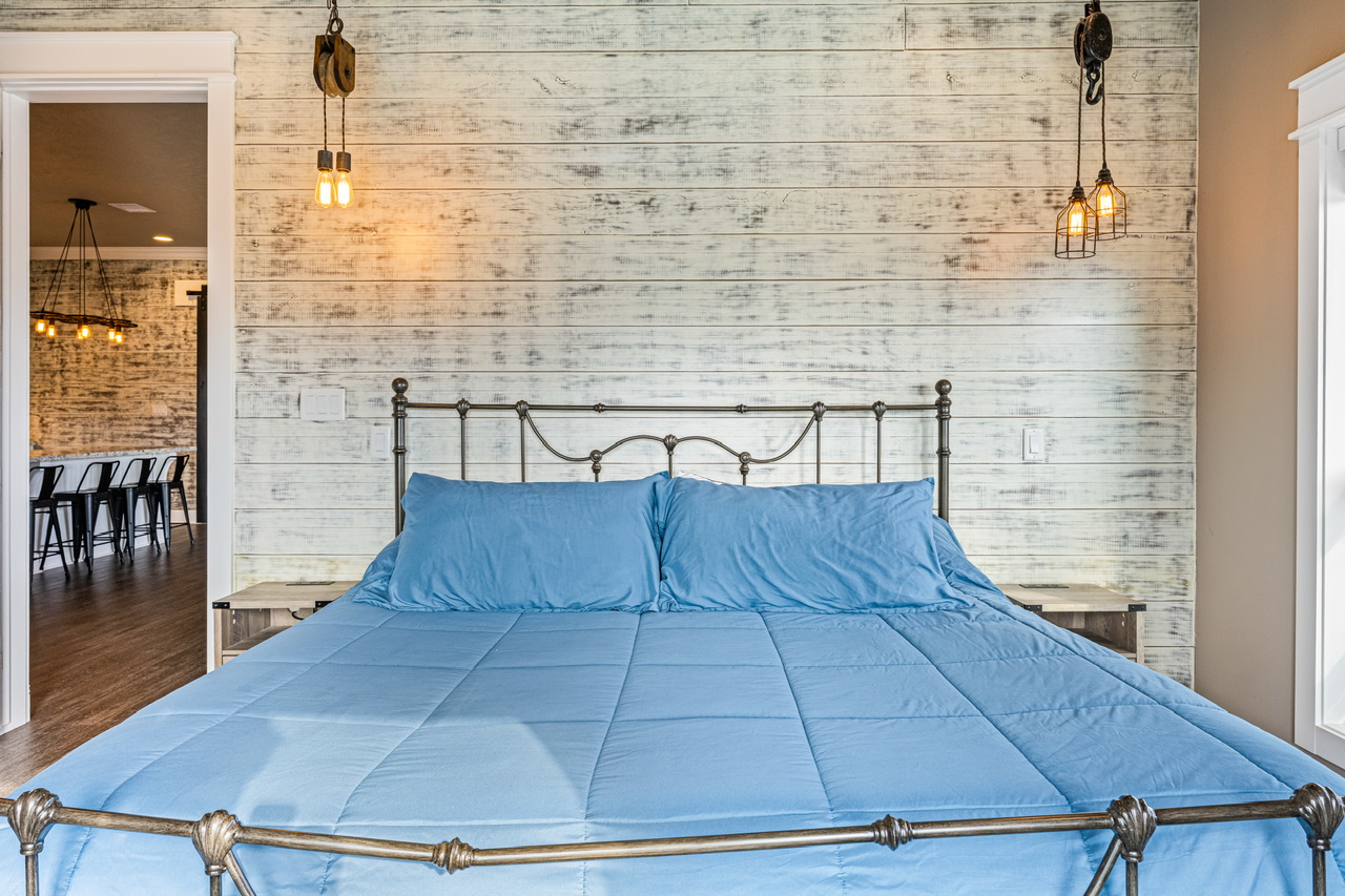 PRIMARY BEDROOM (KING), BEDROOM 2 (QUEEN), BEDROOM 3 (QUEEN/QUEEN BUNK W/ FULL TRUNDLE). PRIMARY BATH (LARGE WALK-IN SHOWER), BATH 2 (SHOWER/TUB COMBO).