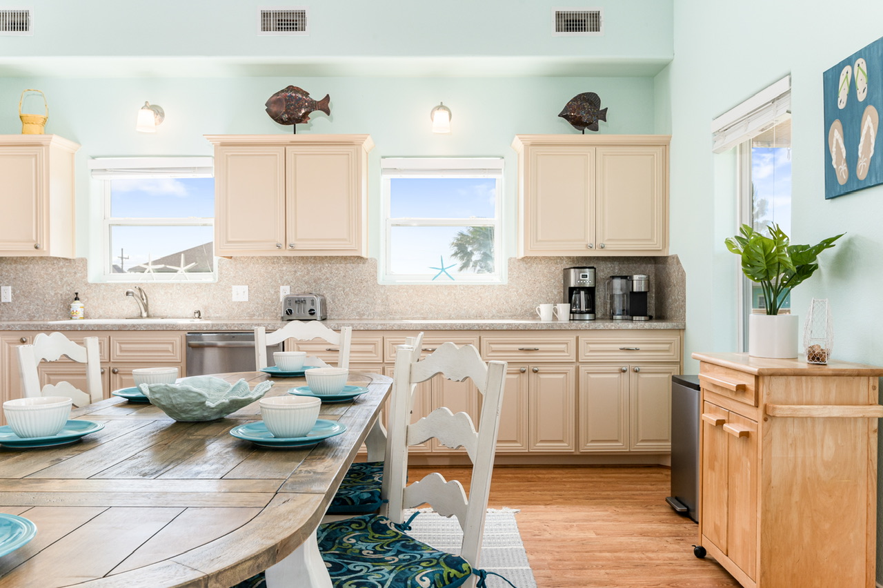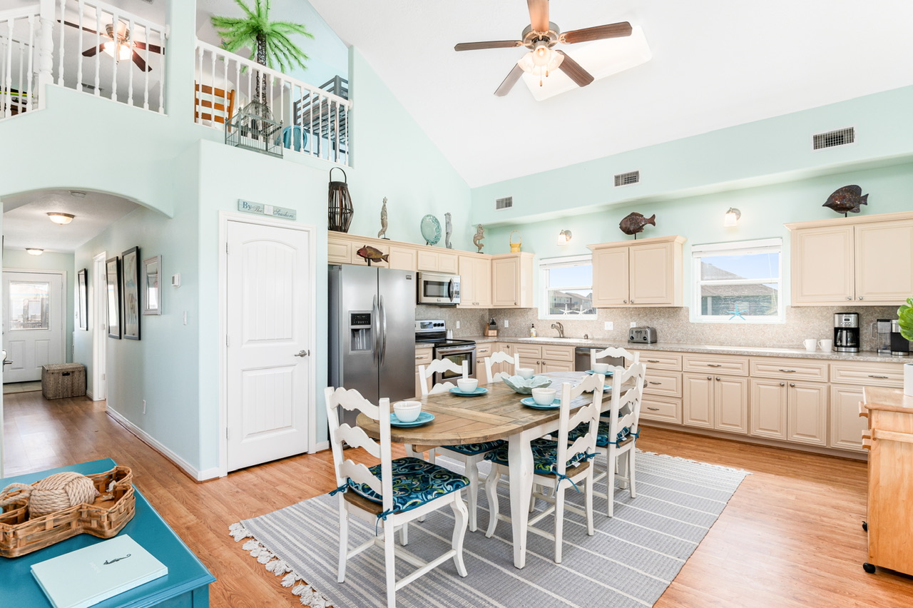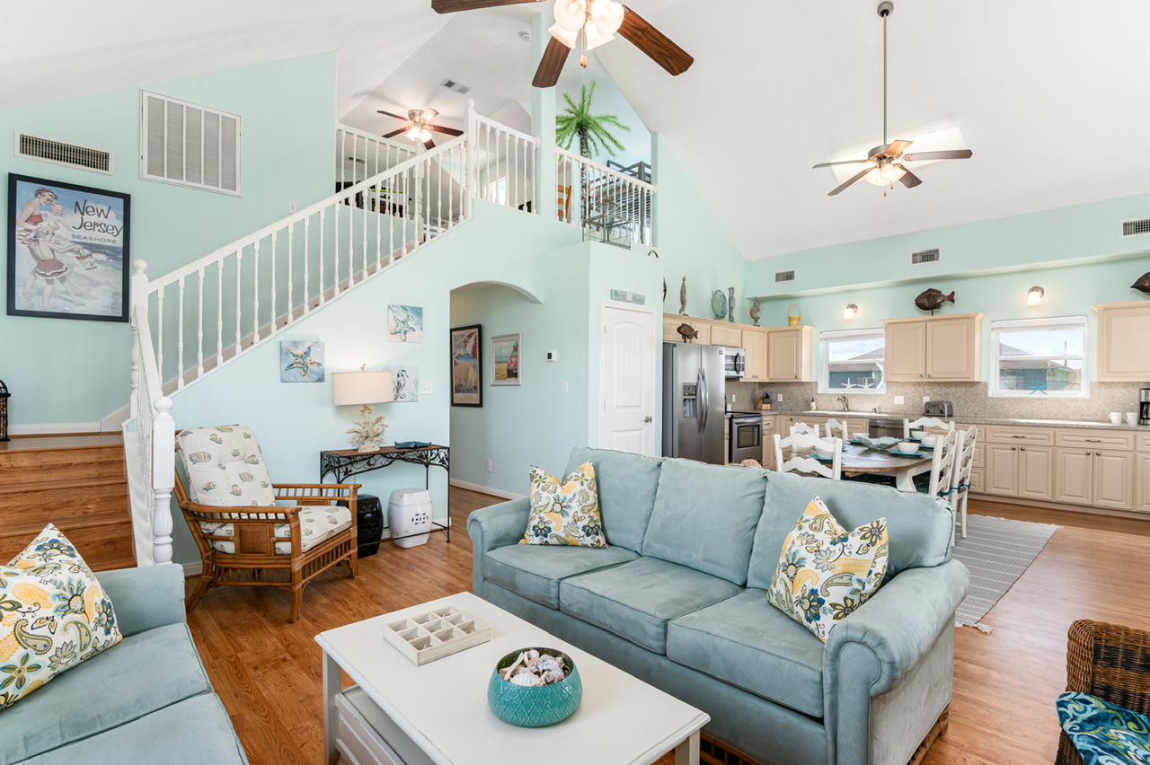 Inside, the home features a bright, open living area with soaring ceilings that create an airy and welcoming space for gathering. The living room flows seamlessly into the dining area and kitchen, making it easy for everyone to spend time together while cooking, relaxing, or planning the next beach day. Coastal touches throughout the home help create a casual beach atmosphere that fits perfectly with the surroundings.