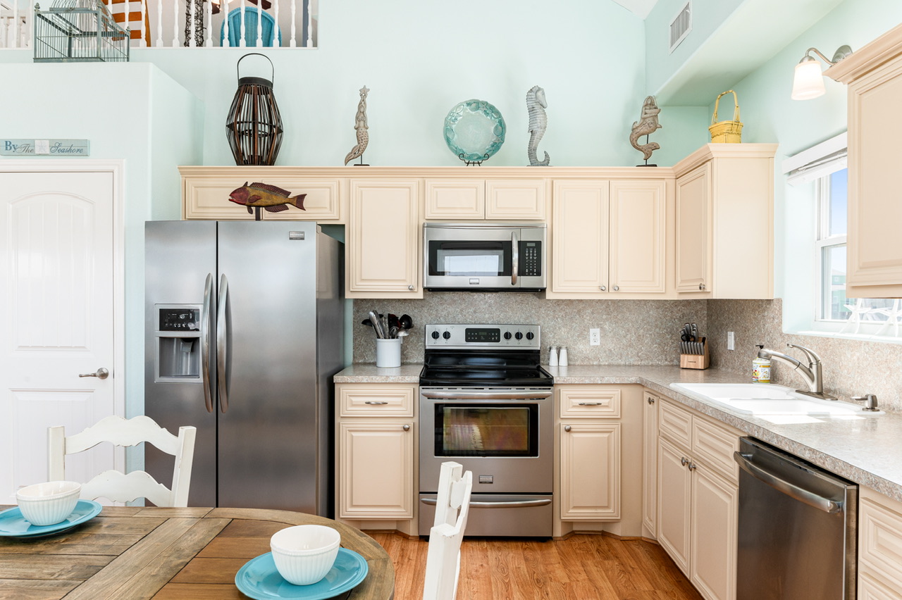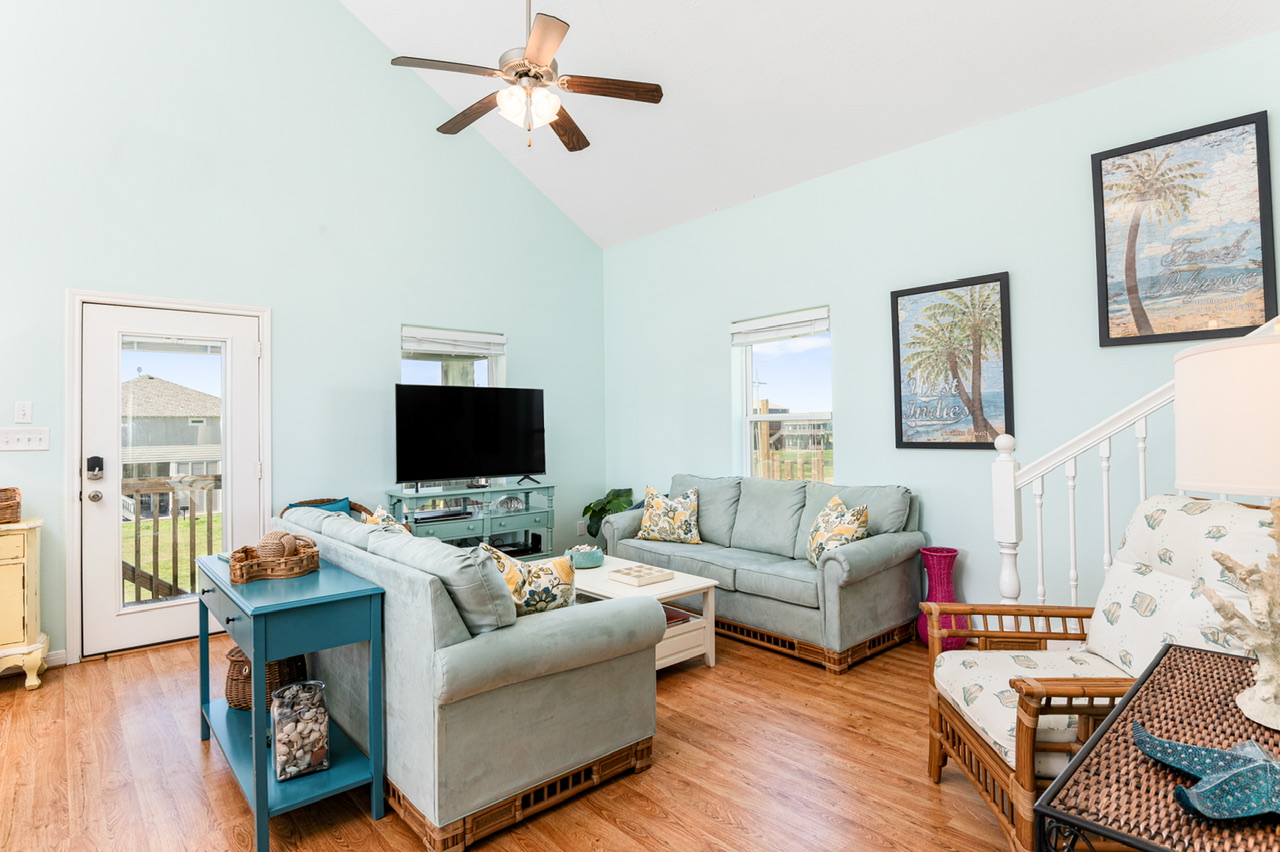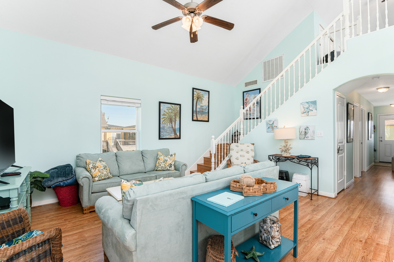 Inside, the home features a bright, open living area with soaring ceilings that create an airy and welcoming space for gathering. The living room flows seamlessly into the dining area and kitchen, making it easy for everyone to spend time together while cooking, relaxing, or planning the next beach day. Coastal touches throughout the home help create a casual beach atmosphere that fits perfectly with the surroundings.