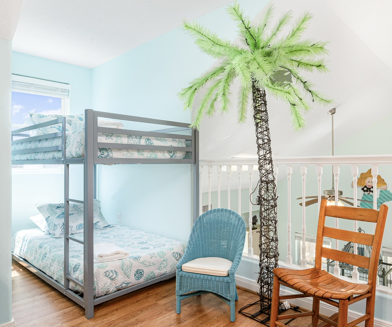 - Upstairs Loft: Queen over Queen bunk, Full over Full bunk, Twin over Twin bunk