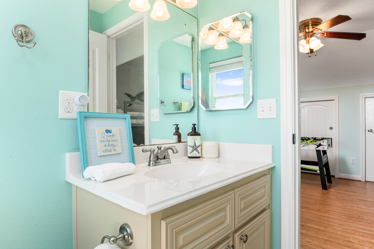 The spacious yard offers room for outdoor games and family fun, while the downstairs area includes several convenient amenities for beach living: