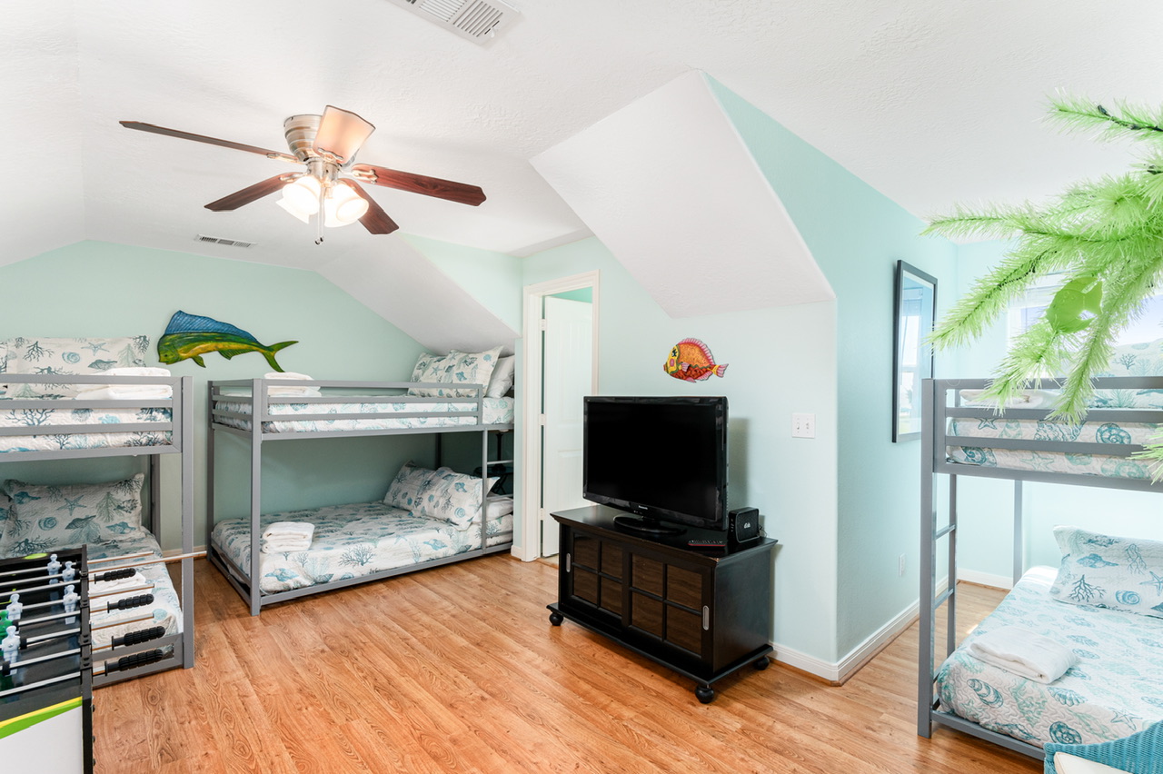 The upstairs loft provides additional space for both sleeping and entertainment, featuring multiple bunk beds, a foosball table, and a convenient half bath.