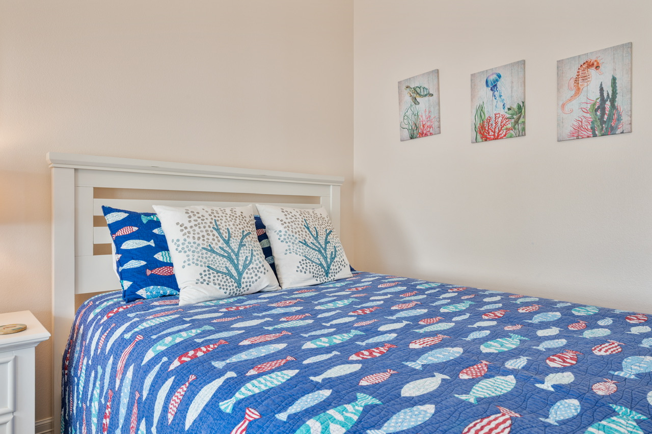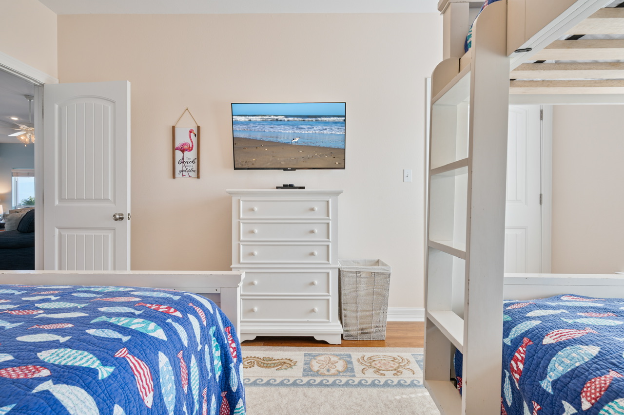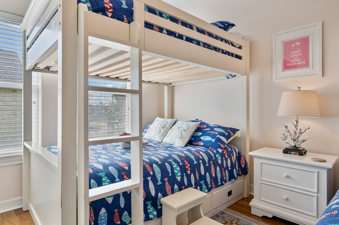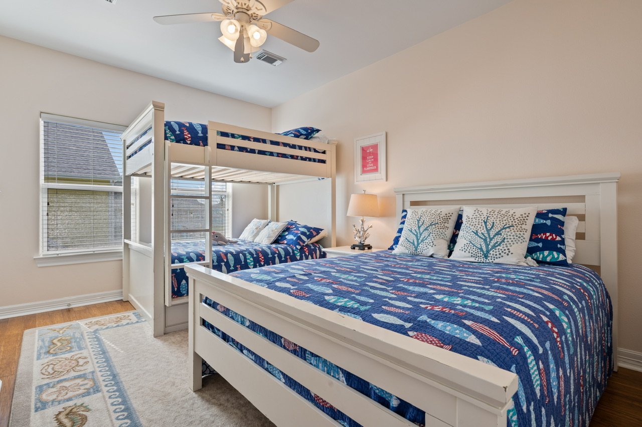 | Rooms | Primary Bedroom (King) w/bath, Bedroom 2 (Queen) w/bath, Bedroom 3 (1 Queen, 1 Full/Full Bunk Bed ). Primary Bath (Walk-in Shower, Separate Tub) Bathroom 2 (Tub/Shower Combo), Guest Bathroom (Tub/Shower Combo). |