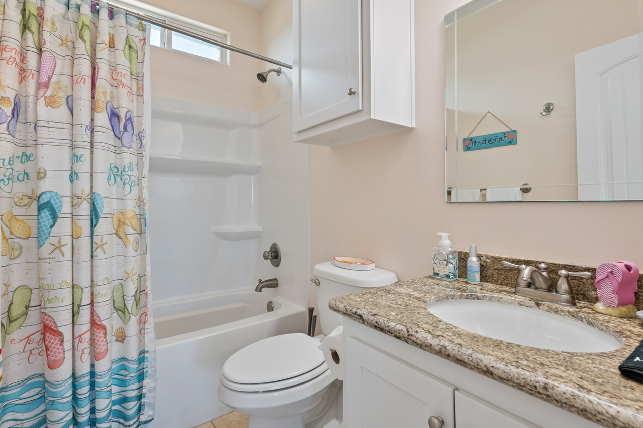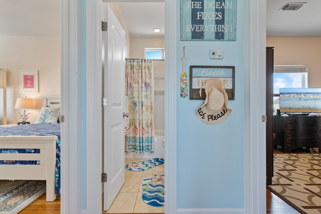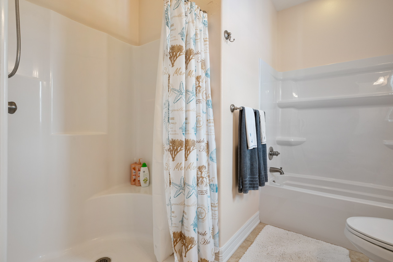 Primary Bedroom (King), Bedroom 2 (Queen) w/bath, Bedroom 3 (1 Queen, 1 Full/Full Bunk Bed ). Primary Bath (Walk-in Shower, Separate Tub), Bathroom 2 (Tub/Shower Combo), Guest Bathroom / Hall (Tub/Shower Combo).