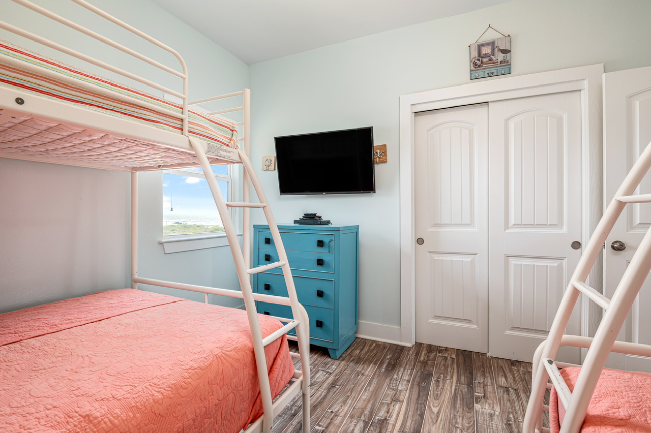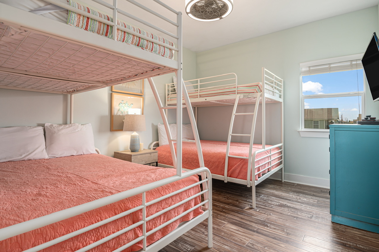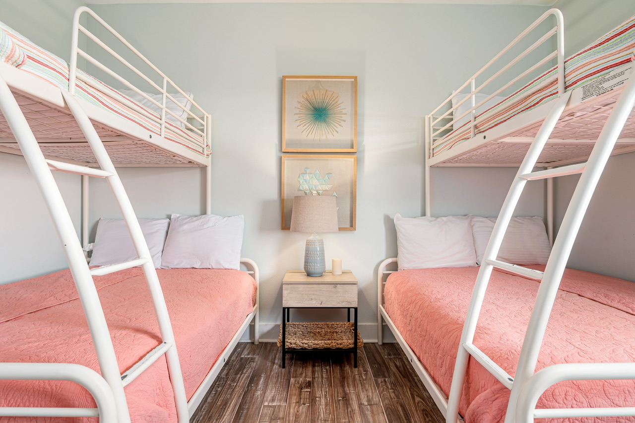 PRIMARY BEDROOM (KING), BEDROOM 2 (QUEEN, TWIN), BEDROOM 3 (2 TWIN/FULL BUNK BEDS). PRIMARY BATHROOM (WALK-IN SHOWER), GUEST BATHROOM (TUB/SHOWER COMBO).