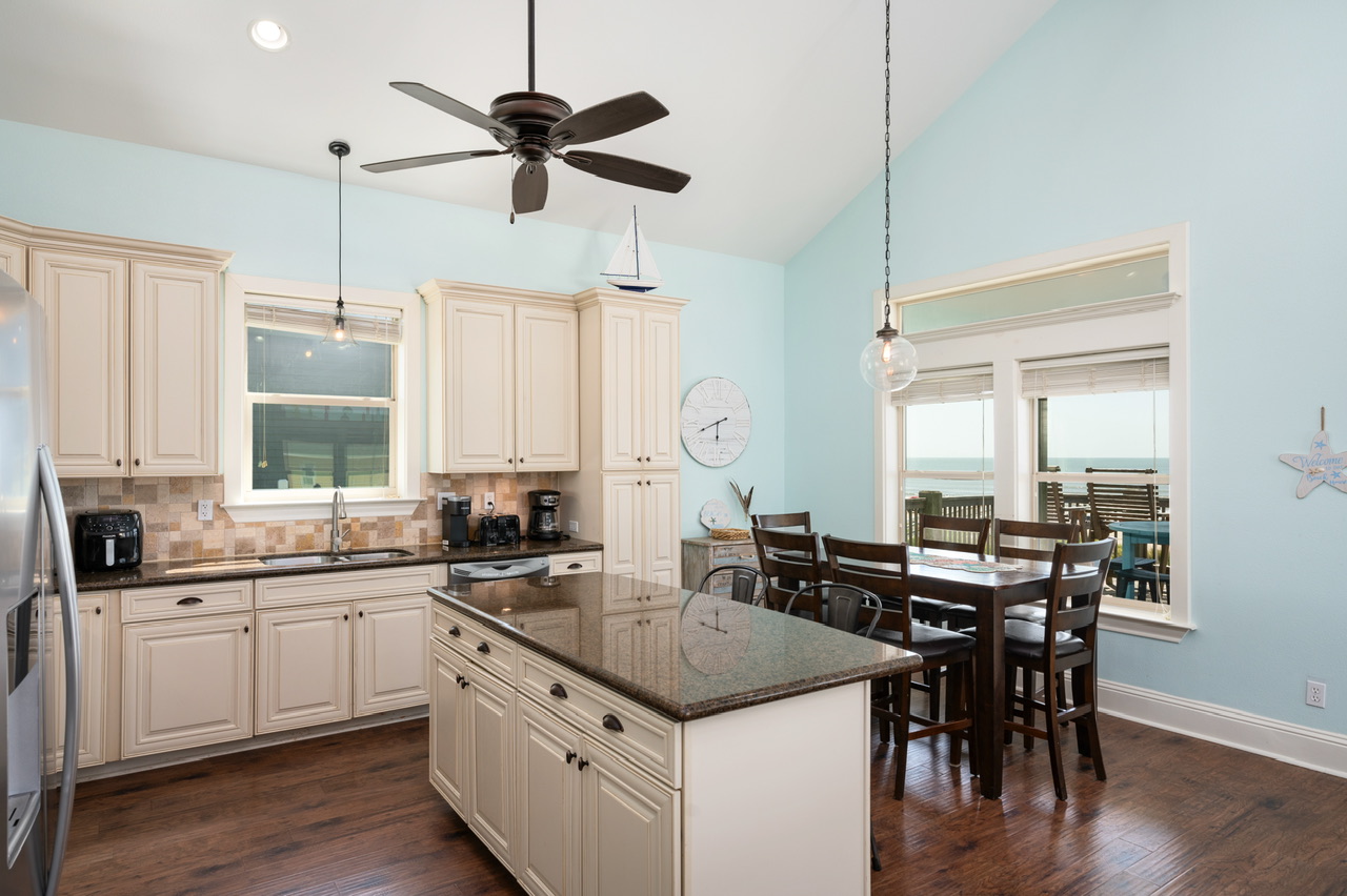The fully equipped kitchen features modern appliances, ample counter space, and all the cookware you need to prepare delicious meals. Enjoy your culinary creations at the dining table with seating for 8, or take your meals outside to the deck for an al fresco experience with ocean views.
