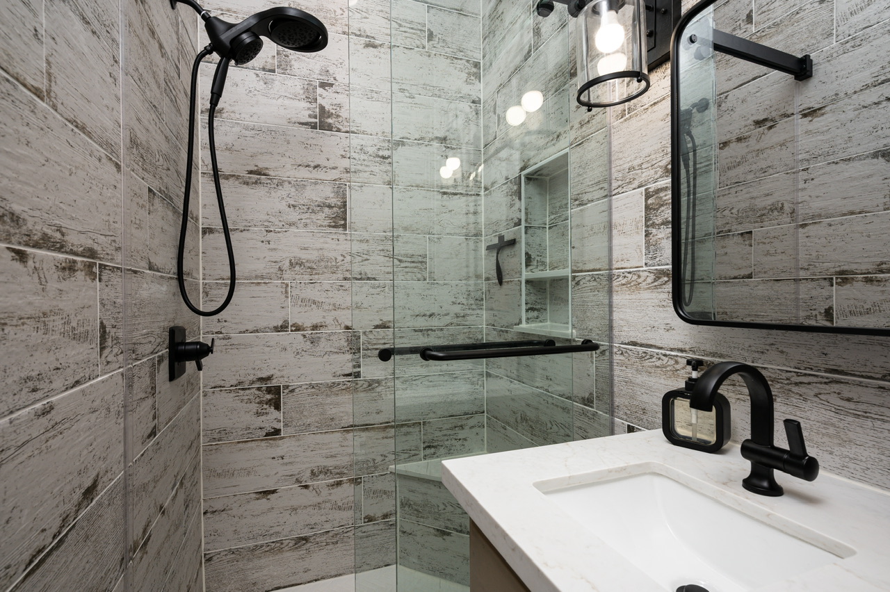 Primary Bedroom (Queen, Triple Twin Bunk), Bathroom (Glass Shower w/bench).