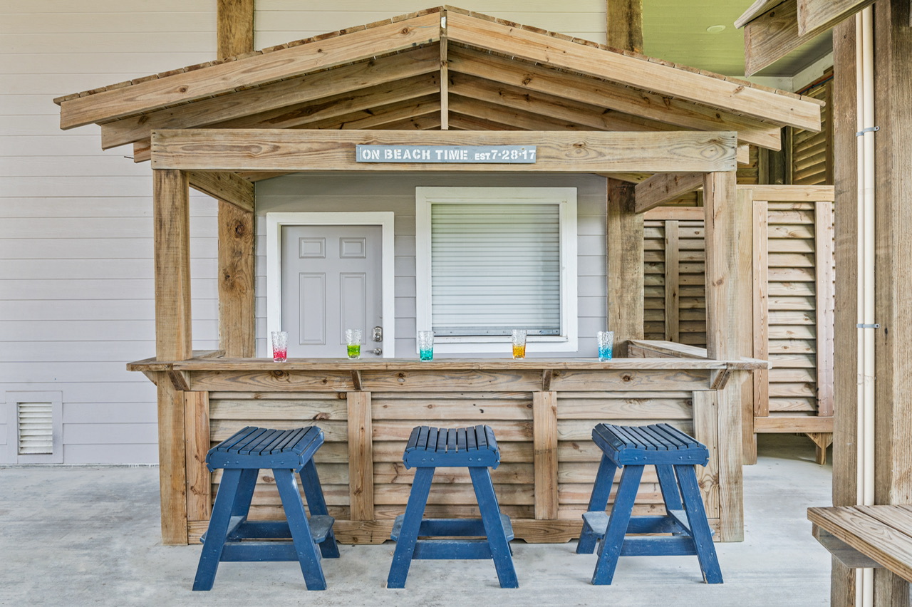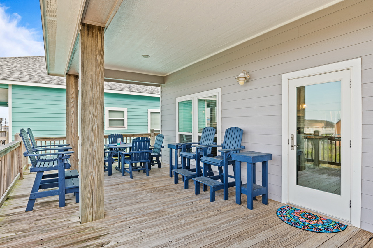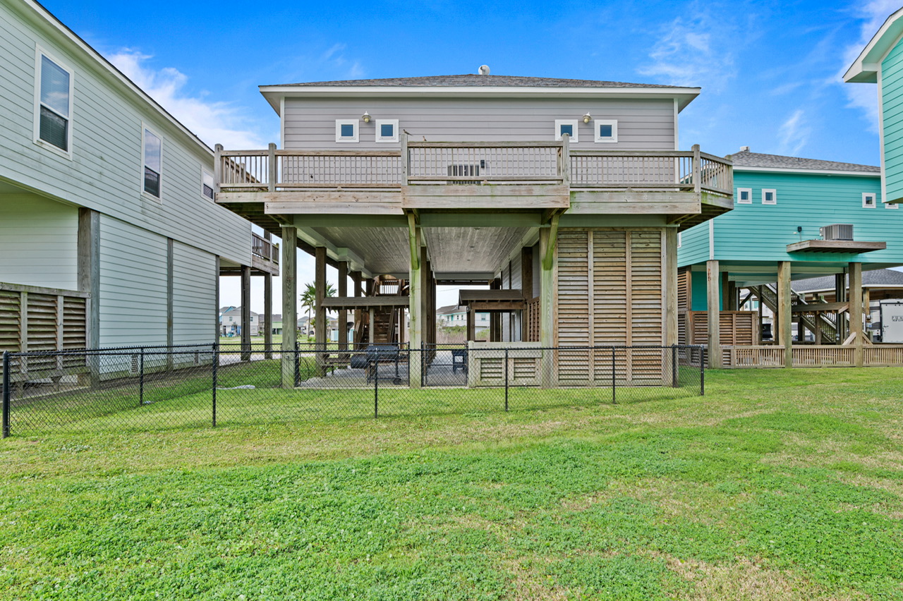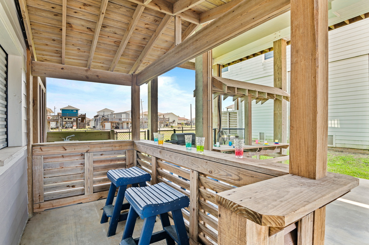 Like most great beach houses, a lot of the fun happens outside. Guests can enjoy Gulf view and deck space for relaxing in the coastal breeze and gathering with friends and family. Downstairs there's covered space and outdoor bar area where you can take a break from the sun, cook out, or just enjoy the laid-back pace of Crystal Beach life.