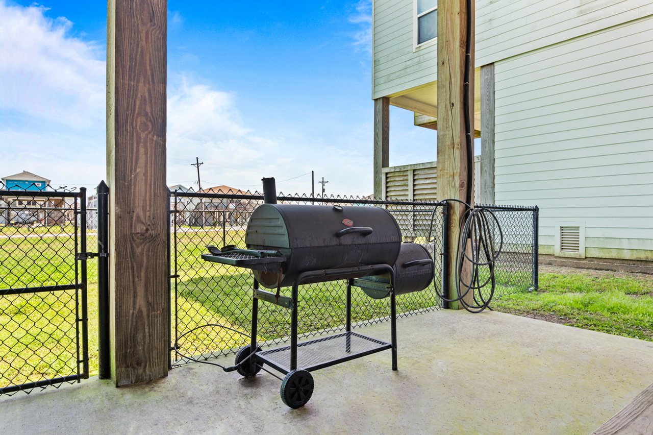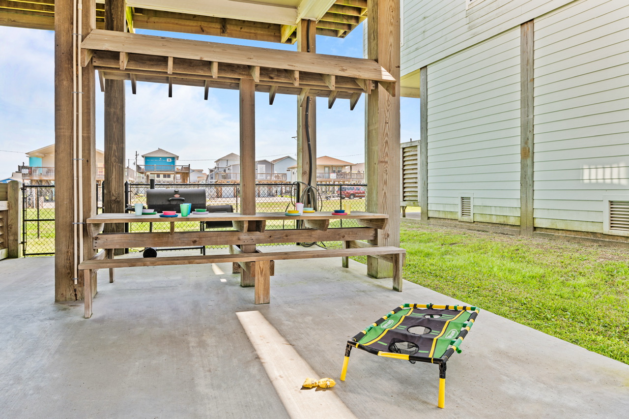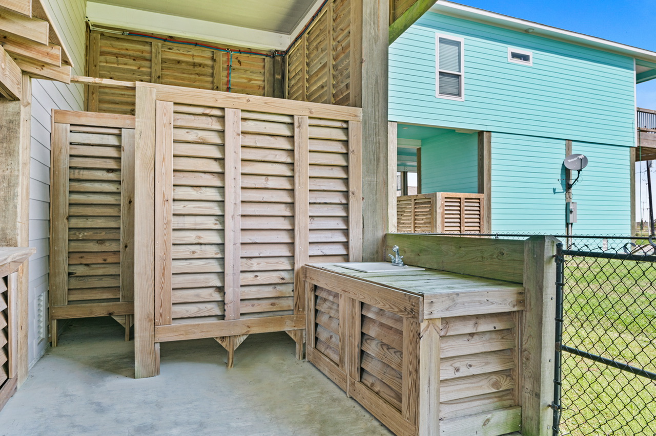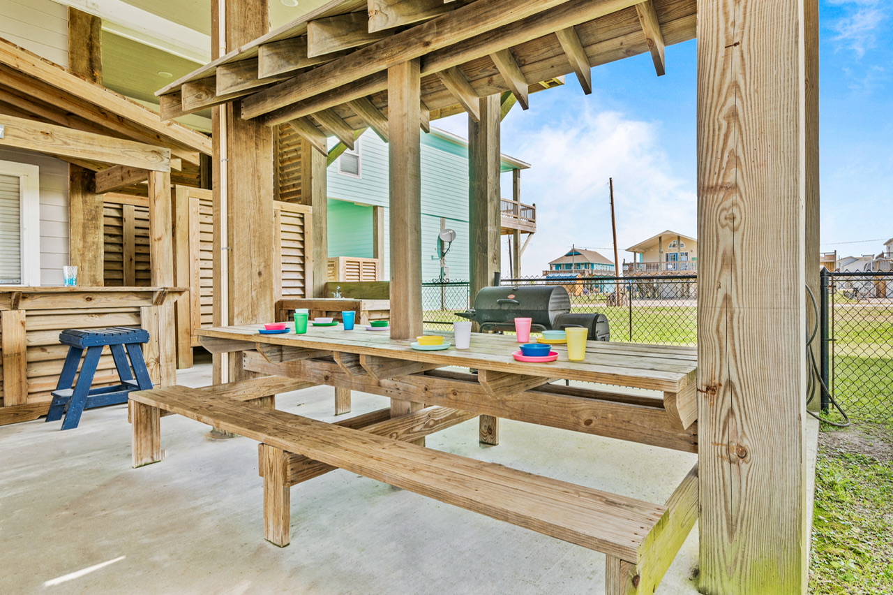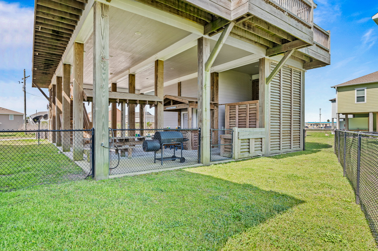 Like most great beach houses, a lot of the fun happens outside. Guests can enjoy Gulf view and deck space for relaxing in the coastal breeze and gathering with friends and family. Downstairs there's covered space and outdoor bar area where you can take a break from the sun, cook out, or just enjoy the laid-back pace of Crystal Beach life.