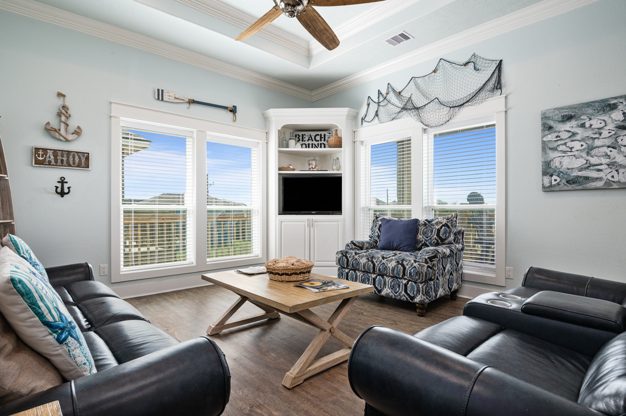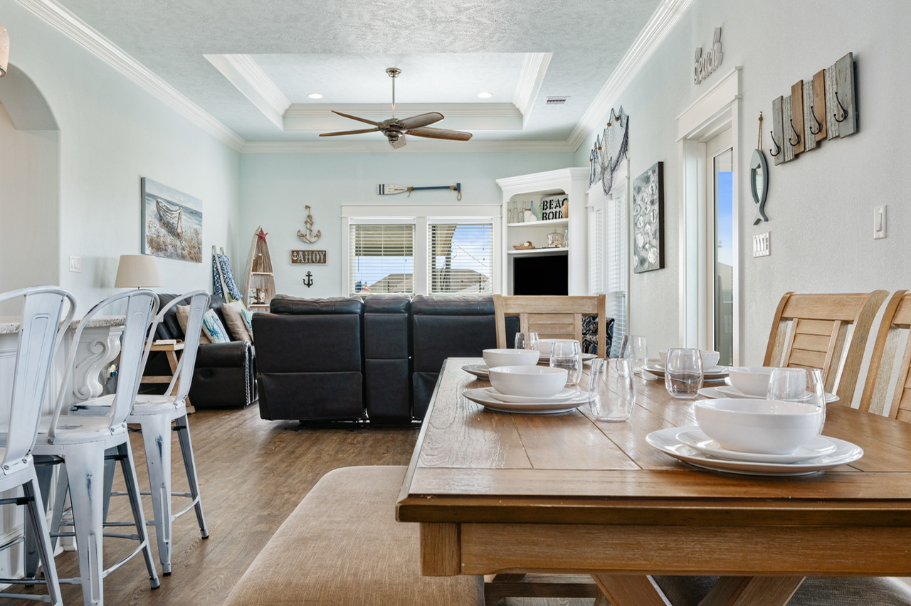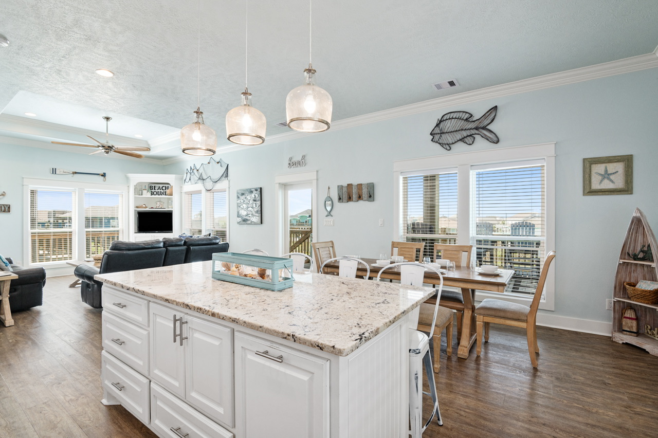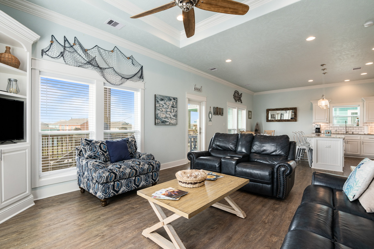 The main living area is open and welcoming, with comfortable seating and plenty of space for everyone to hang out together after a day on the beach. The living room flows right into the kitchen and dining area, making it easy for the group to stay connected.