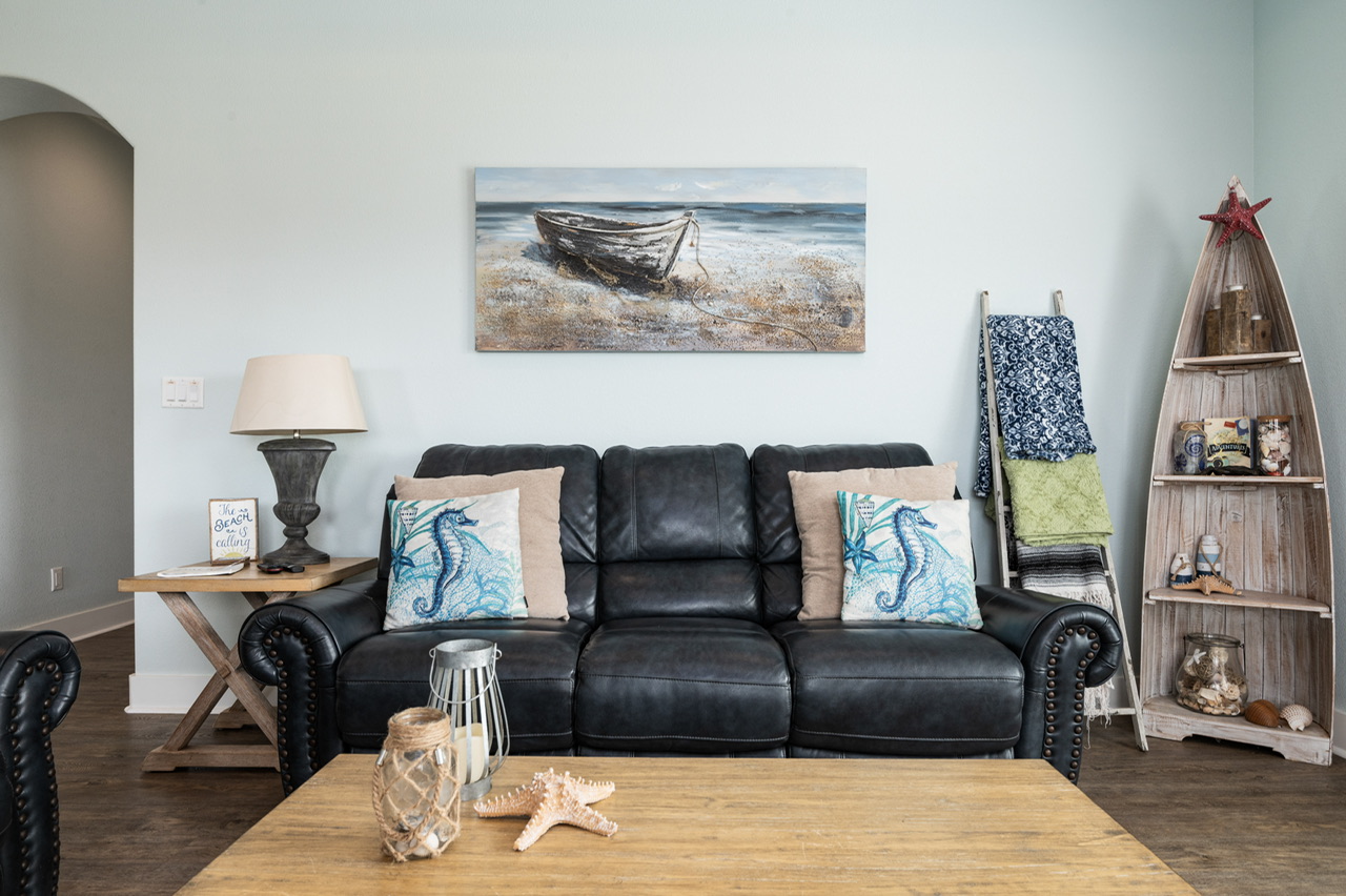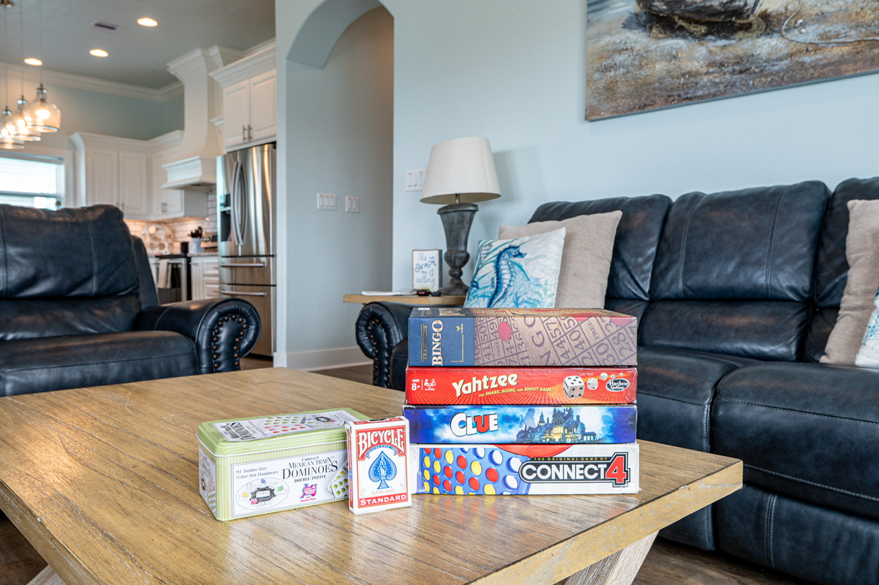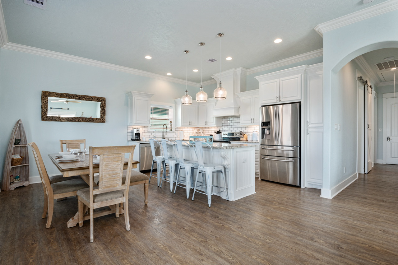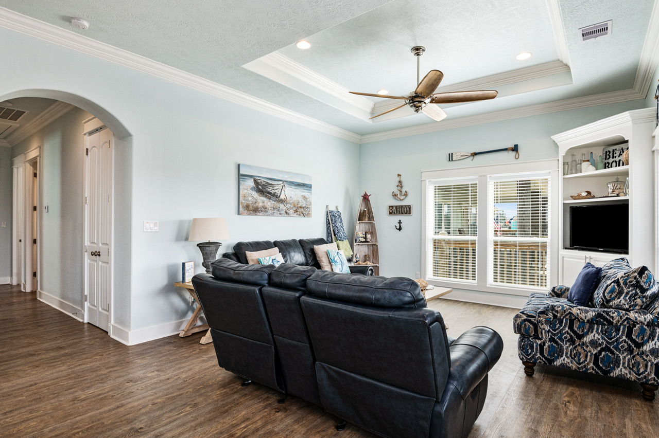 The main living area is open and welcoming, with comfortable seating and plenty of space for everyone to hang out together after a day on the beach. The living room flows right into the kitchen and dining area, making it easy for the group to stay connected.