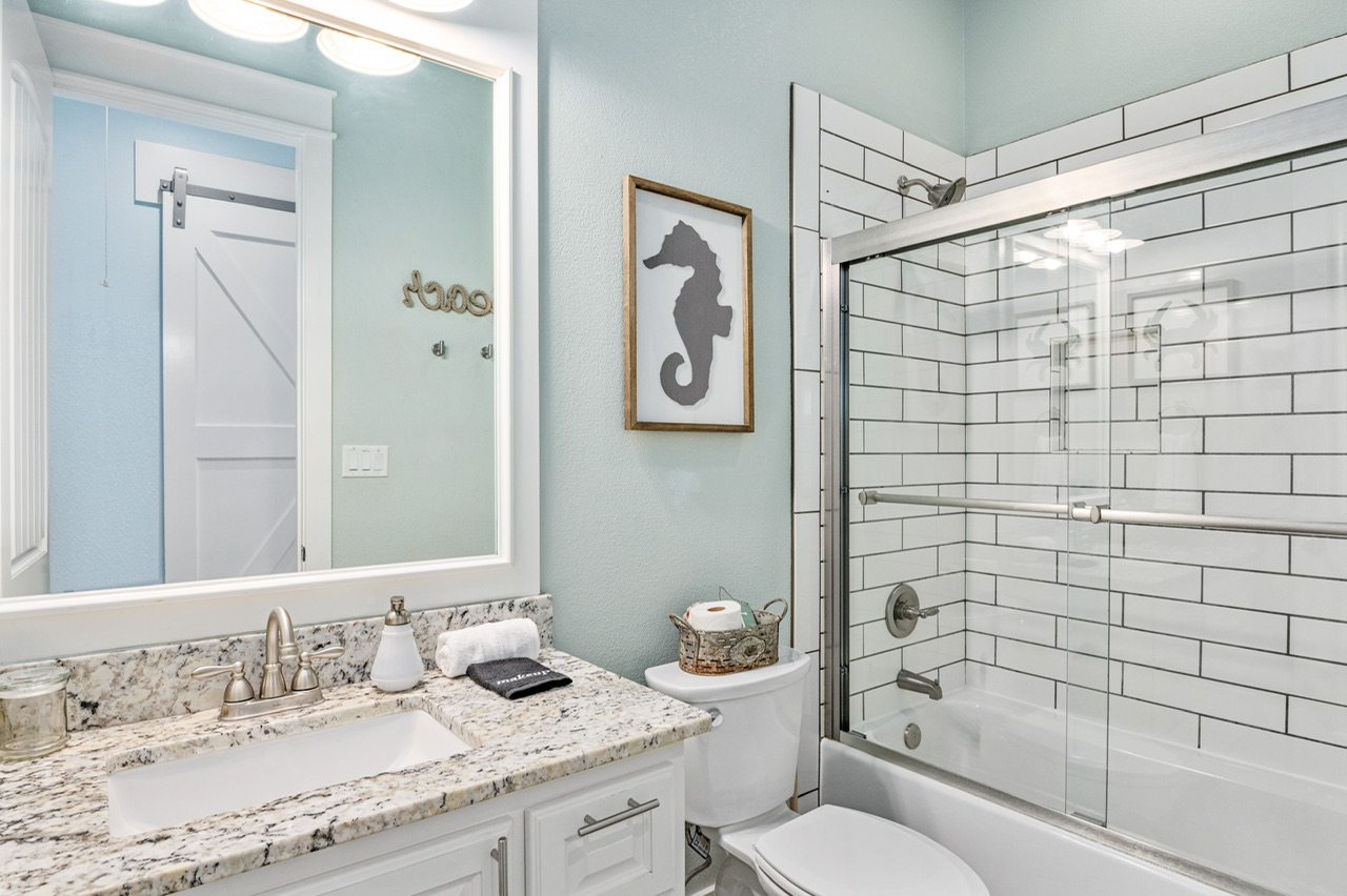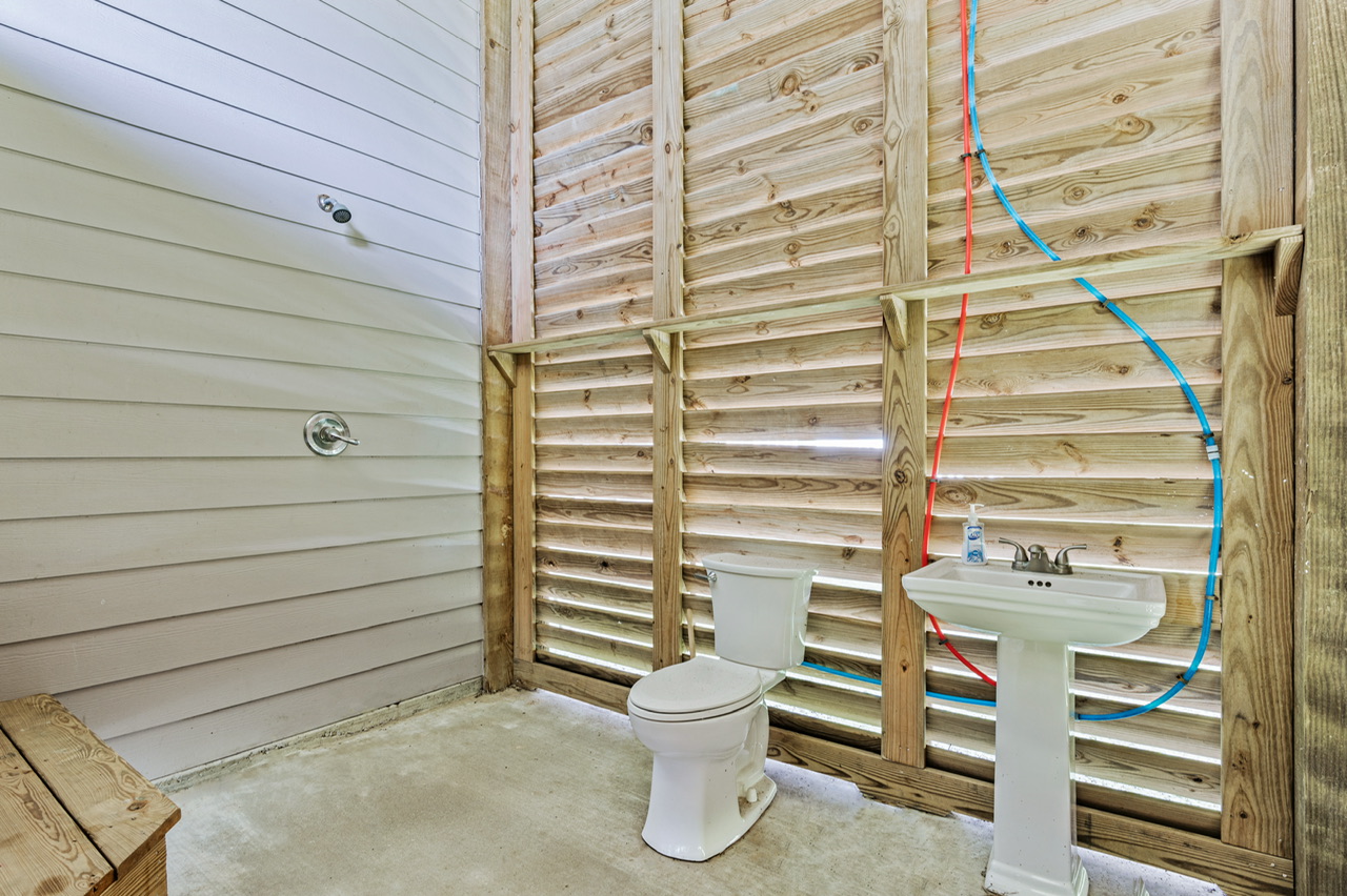 Primary Bedroom (King), Bedroom 2 (2 Queen beds), Bedroom 3 ( 2 Full/Full bunk beds). Primary Bath (Tub and Separate Shower), Guest Bath (Tub/Shower Combo), Half bath w/ outdoor shower.