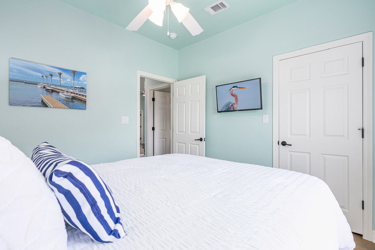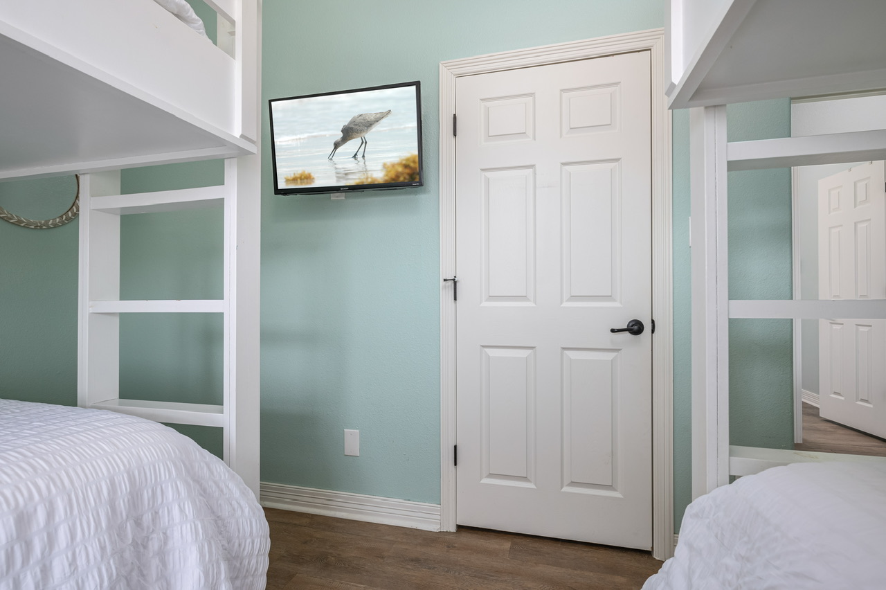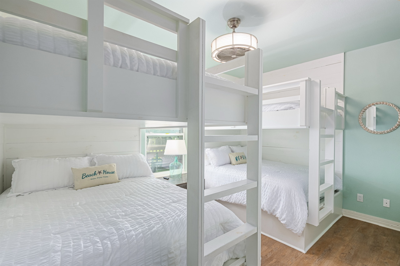 The spacious master suite features a king bed, with private bath. The first guest room is beautifully decorated with a queen bed, while the second guest room was designed with the kids in mind. It has two sets of custom queen-over-queen bunks with shiplap and can sleep eight. All bedrooms feature large closets with hangers along with ample drawer space. Several suitcase racks are also provided.