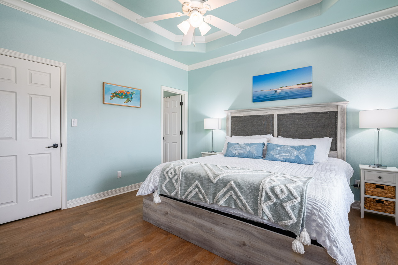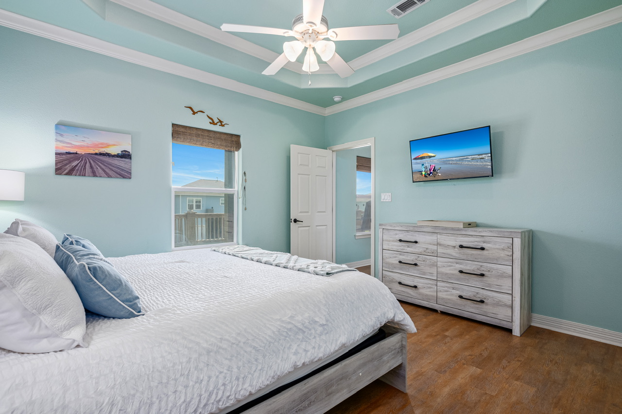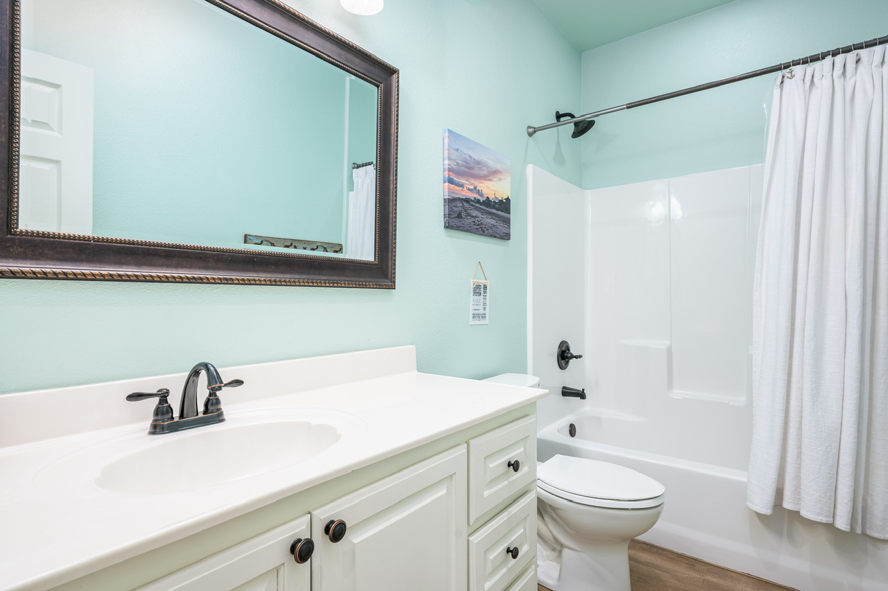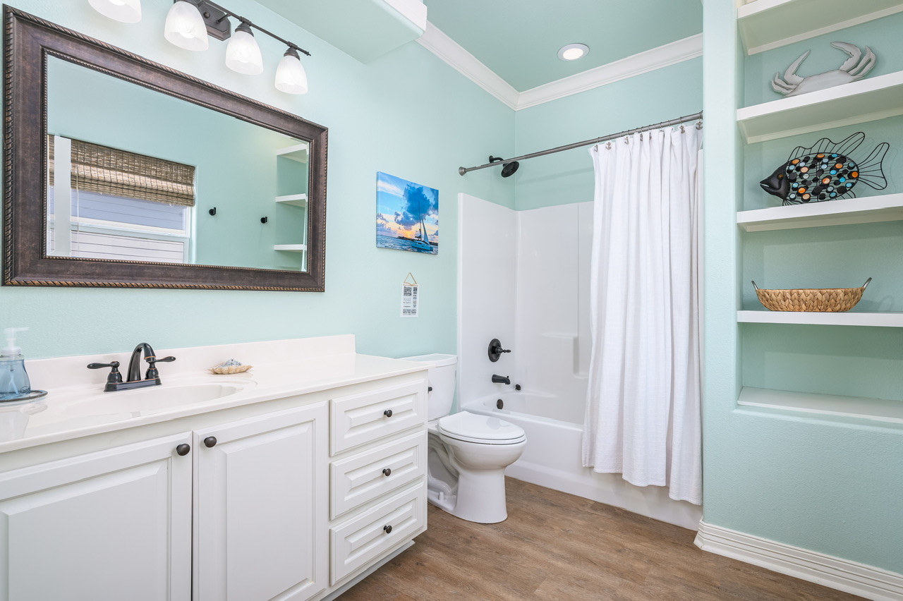 The spacious master suite features a king bed, with private bath. The first guest room is beautifully decorated with a queen bed, while the second guest room was designed with the kids in mind. It has two sets of custom queen-over-queen bunks with shiplap and can sleep eight. All bedrooms feature large closets with hangers along with ample drawer space. Several suitcase racks are also provided.