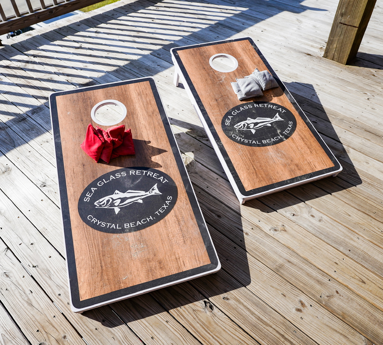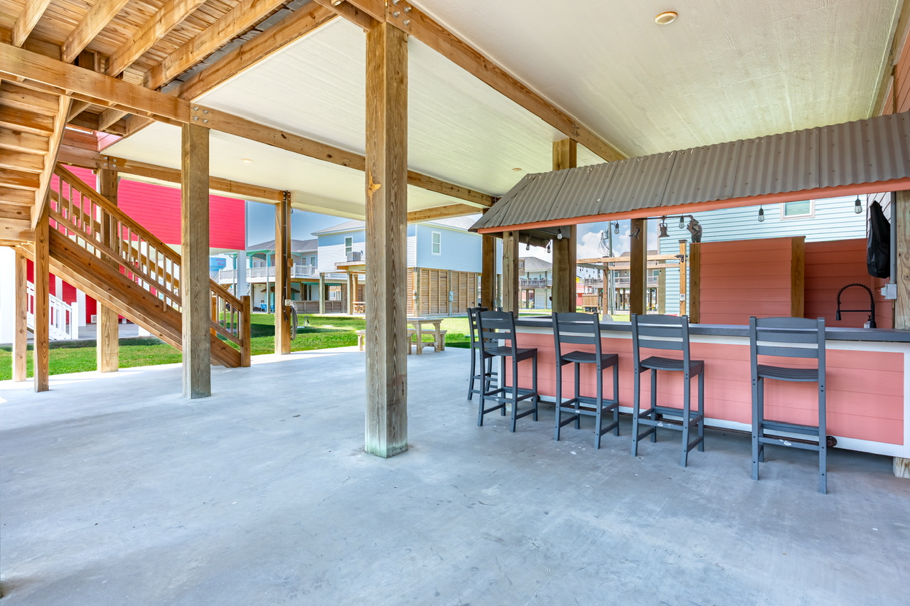 The downstairs area was designed with outdoor entertainment in mind. The custom bar area has ample seating for meals or to enjoy a cold beverage. It also features a sink, large countertops, a smart TV and LED lighting. An assortment of beach toys is provided underneath the bar, and cornhole boards and charcoal grill are also available.
