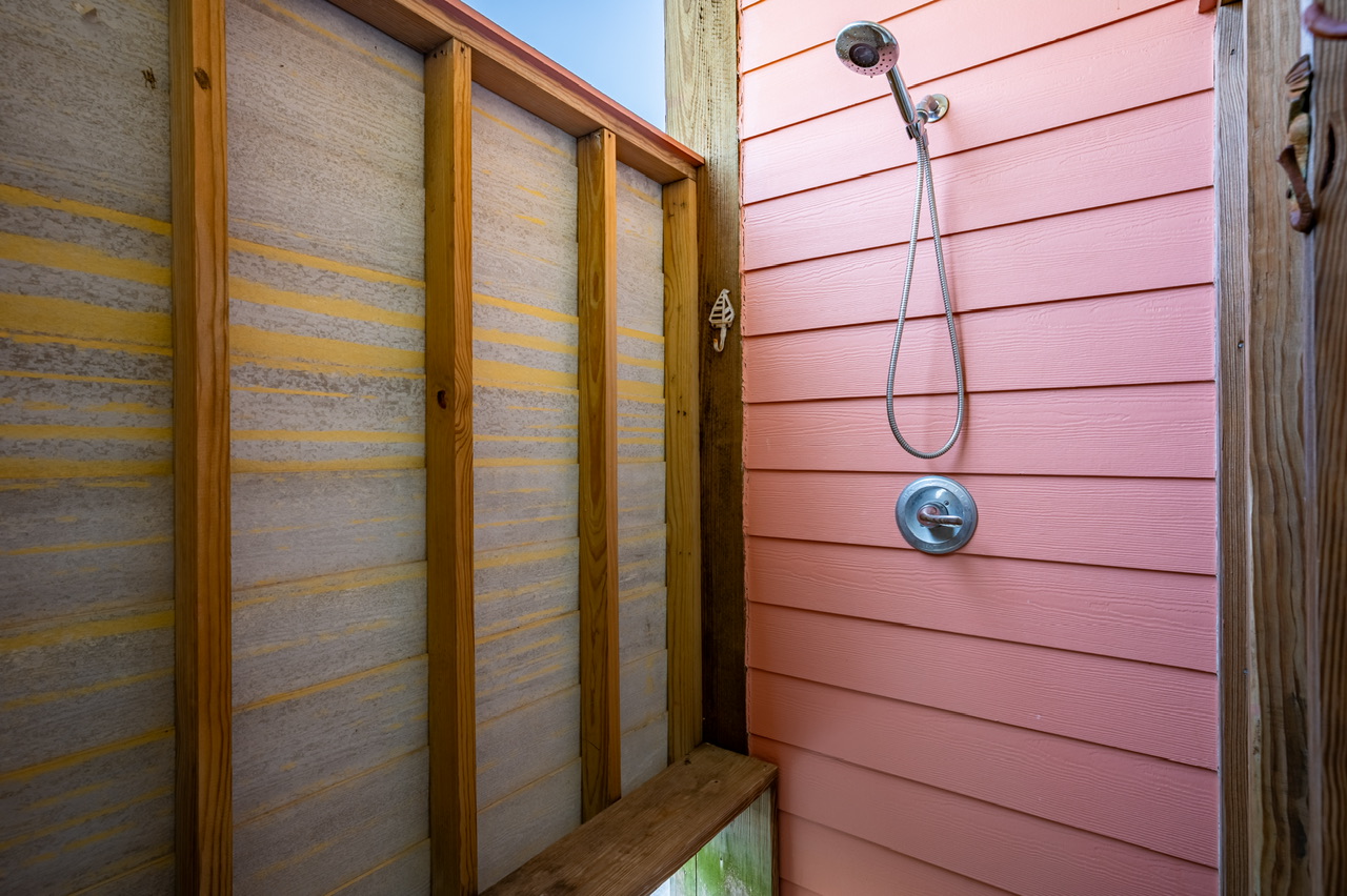An outdoor shower, with hot and cold water, is located downstairs to rinse off after returning from the beach.