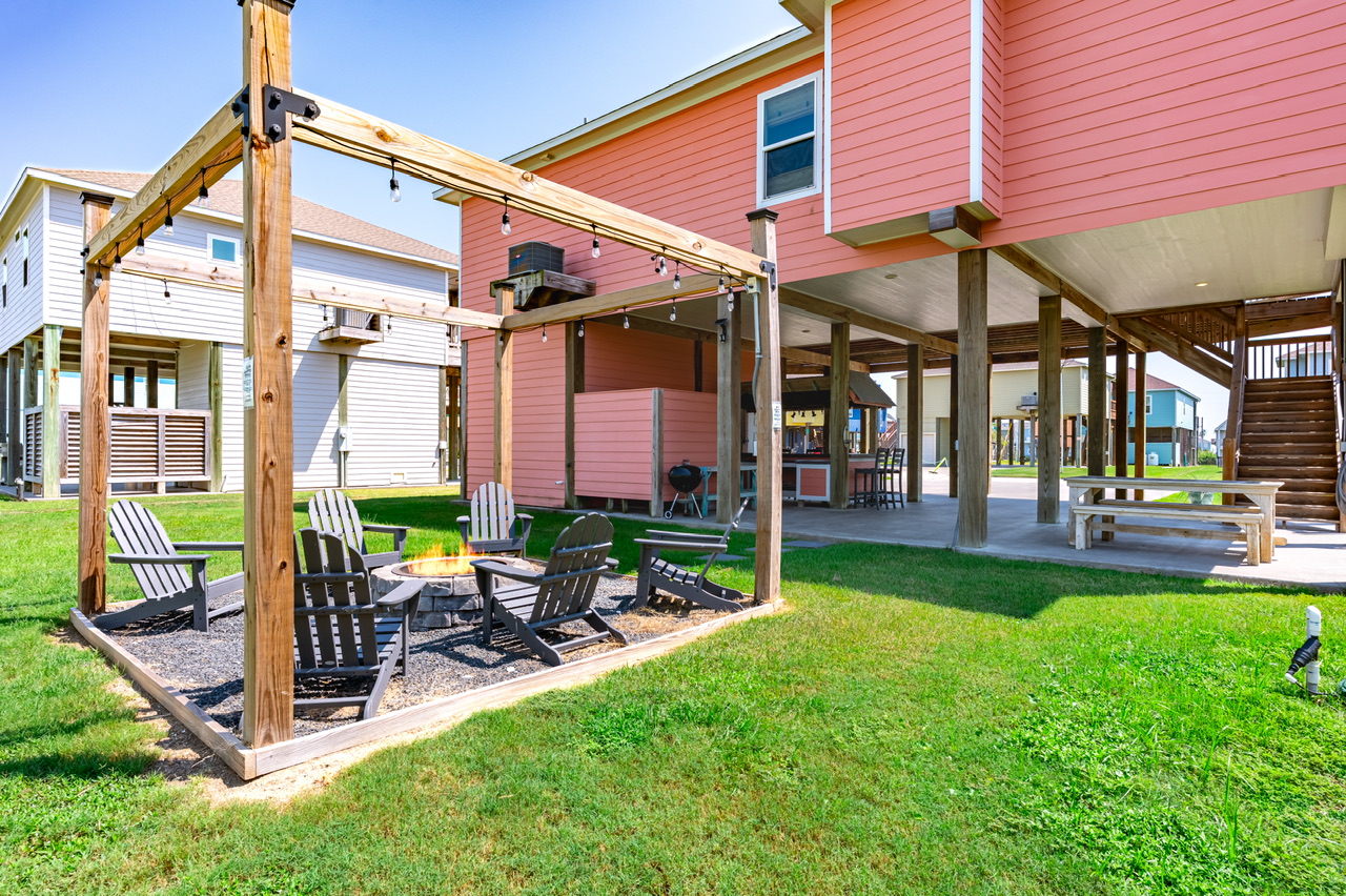 A custom firepit area with lighting and ample seating is located just behind the home and allows guests to enjoy the property during evenings or in the cooler months.