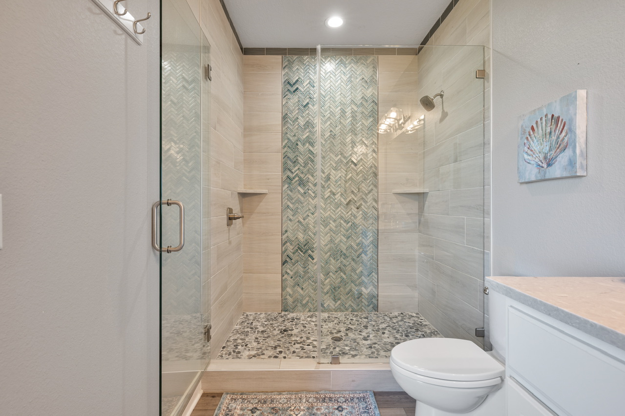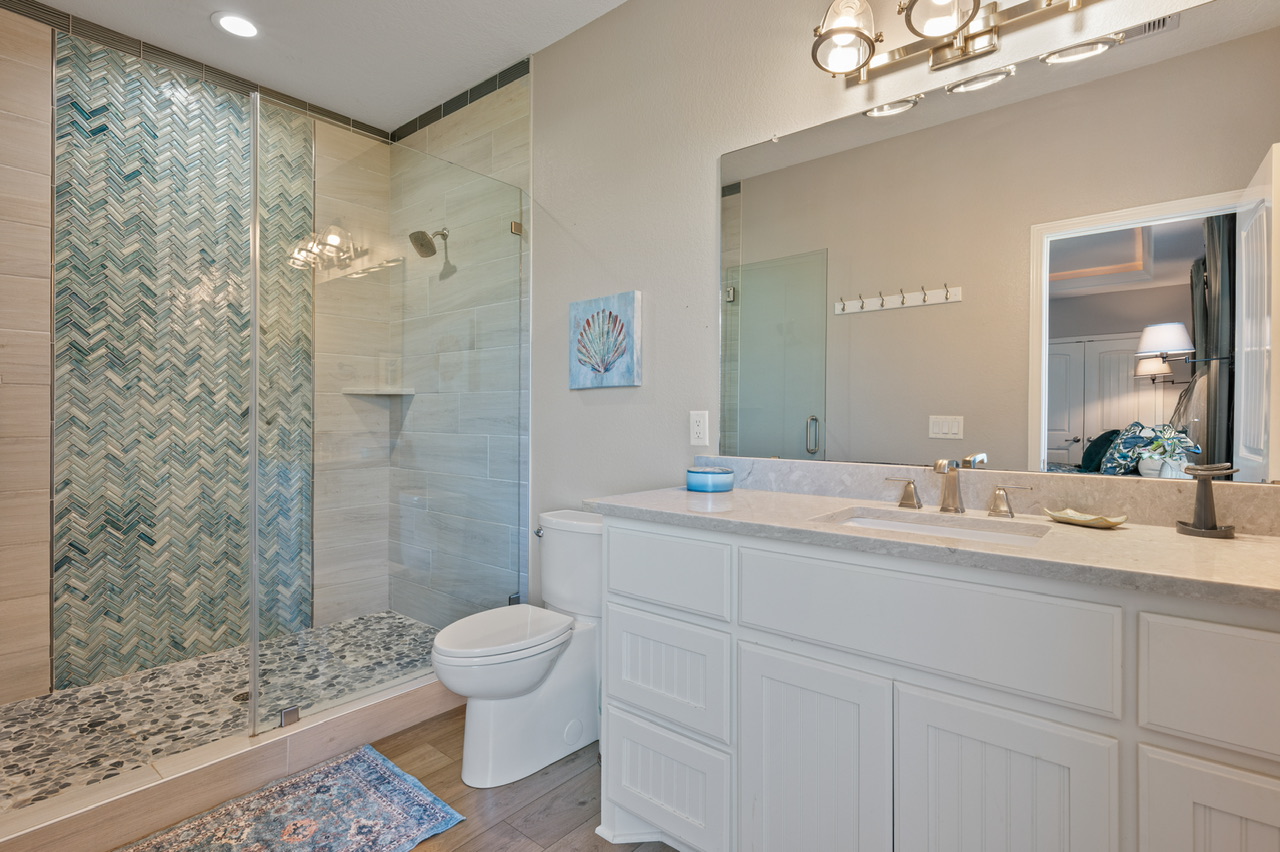 Primary Bedroom (King), Bedroom 2 (2 Queens), Bedroom 3 (Queen/Queen Bunk, 1 Twin), Extra Sleeping (Queen Sleeper Sofa). Primary Bath (Large Walk-in Shower), Guest Bath (Tub/ Shower Combo).